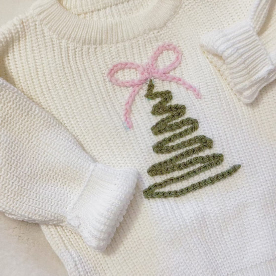 This adorable white chunky knit sweater is hand embroidered with a playful zig zag Christmas tree topped with a sweet pink bow. Designed for girls from 0-3 months up to 3/4T, it’s the perfect cozy and festive outfit to keep your little one warm and merry this holiday season.