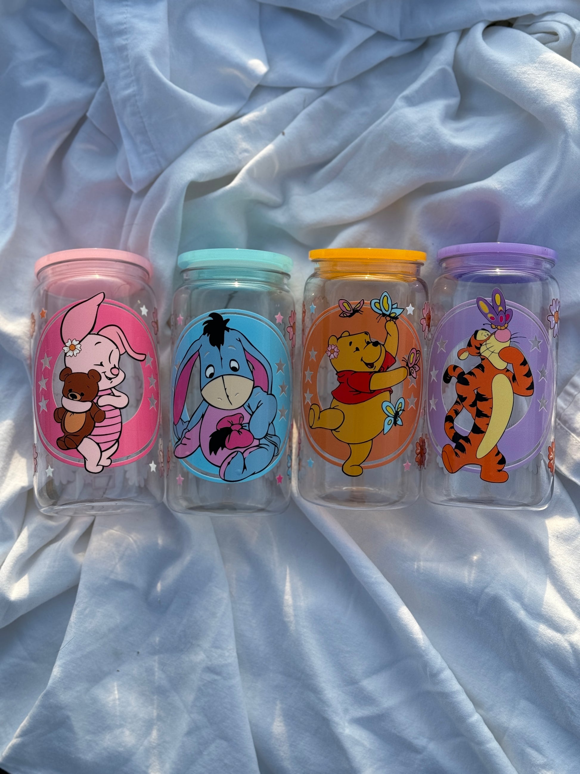 Sip and enjoy with this adorable set of 4 acrylic cups featuring childhood favorite bear and friends. Each cup holds 16 ounces and comes with a lid and straw for on-the-go fun. Elevate your drink routine with these colorful cups.
