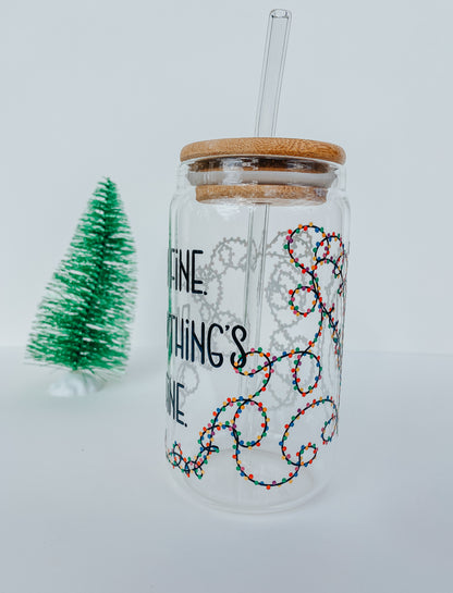 Add some quirky charm to your holiday season with All American Ashley's original design, 16-ounce Christmas lights glass cup. This cup is a delightful mix of festive and fun, featuring a frenzied tangle of Christmas lights that captures the joyful chaos of the season. The cup is adorned with the words "I'm fine, it's fine," adding a humorous twist to those moments when the holiday hustle and bustle feels a bit overwhelming. Whether you're sipping your morning coffee or enjoying a late night smoothie, this glass cup is a whimsical addition to your festivities. Share a laugh with friends and family, and make every sip a little brighter with our Christmas Lights Glass Cup. It's the perfect gift for those who embrace the holiday spirit with a sense of humor!
